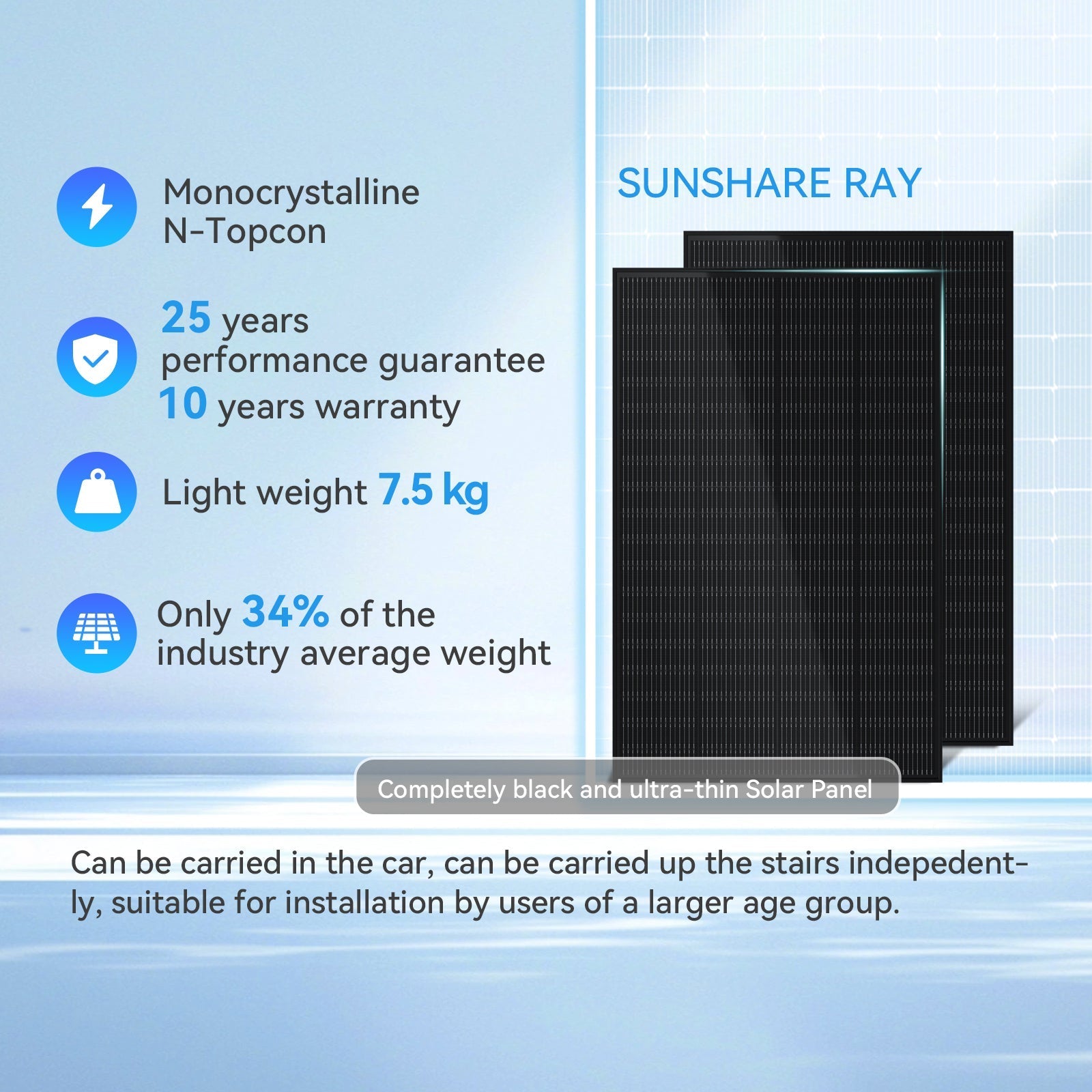 Most solar systems require drilling, tools, and complicated setup. Sunshare Ray is different. With a Plug and Play design and 95% pre-assembled components, including the mount, module, and inverter, you’re ready to go right out of the box. No drilling. No wiring knowledge. Just unpack, place, plug in—and start generating power in as little as 10 minutes.